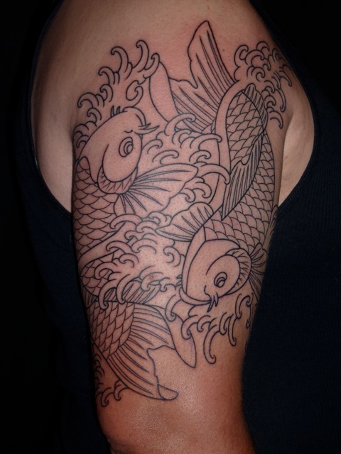 Wanted to go for a bit bolder on the water and outer edges of the fish, and a bit more delicate in the scales and fins. I think the contrast reads pretty well (strong yet graceful was the idea).